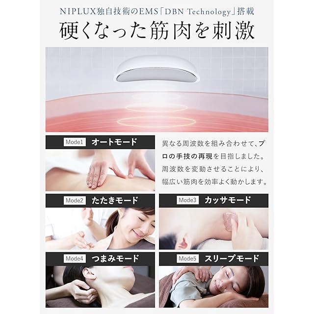 【5種類のEMSモード+16段階のEMSレベル】NIPLUX独自の理論に基づき、周波数とパルス波を組み合わせた[DBN Technology]を搭載。異なる周波数を組み合わせることで、プロの手技の再現を目指しました。※初めて使用する方は、レベル1からお試しください。