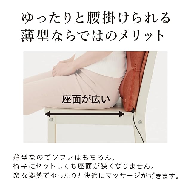 【ゆったりと腰掛けられる薄型ならではのメリット】薄型なのでソファはもちろん、椅子にセットしても座面は狭くなりません。楽な姿勢でゆったりと快適にマッサージできます。