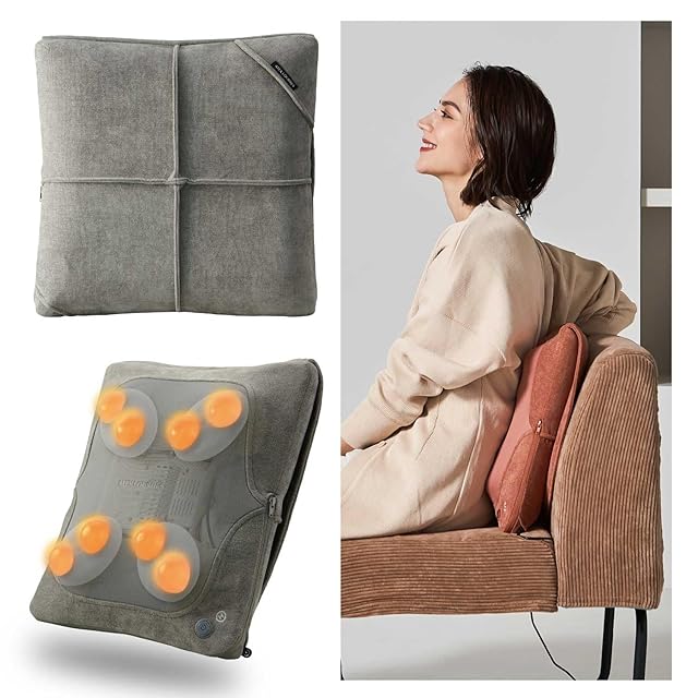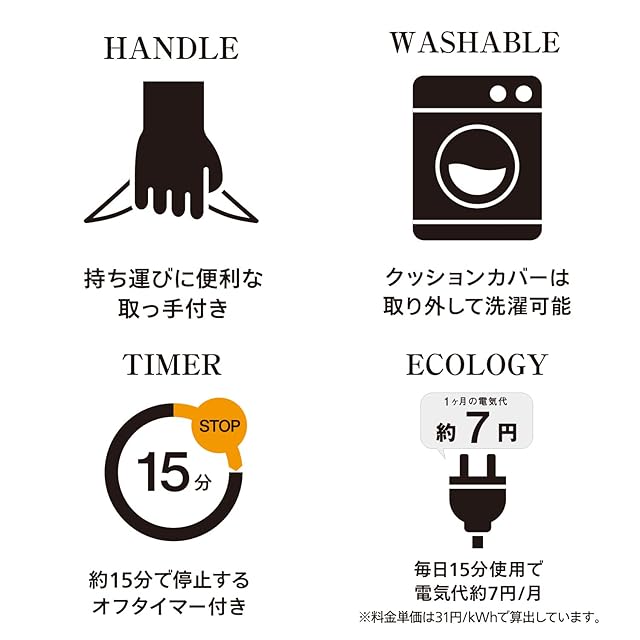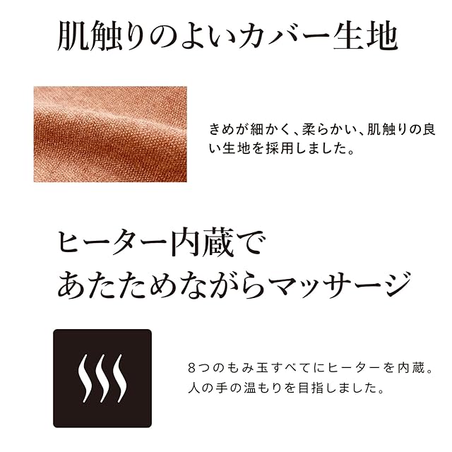 【その他機能】電源ボタンが凸になり、手探りでの使いやすさを向上。押し間違いにくく、すっきりしたフォルムになりました。ヒーター内臓であたためながらマッサージが可能。持ち運びに便利な取っ手付き。クッションカバーは取り外して洗濯可能。約15分で停止するオフタイマー付き。