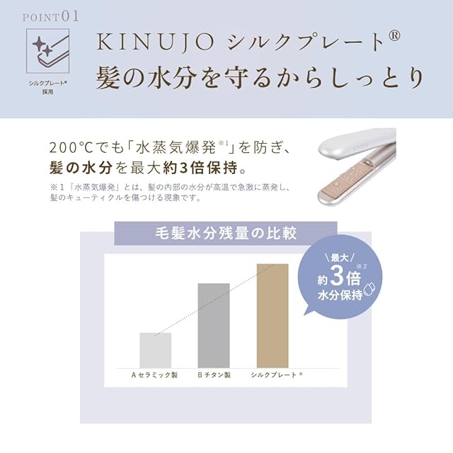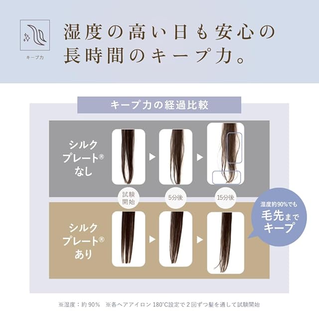 Point 01 Damageless 髪のダメージを抑える シルクプレートが摩擦ダメージを軽減させ、髪の水分を保持。湿気の多いでも、思い通りのヘアスタイルを1日中キープします。