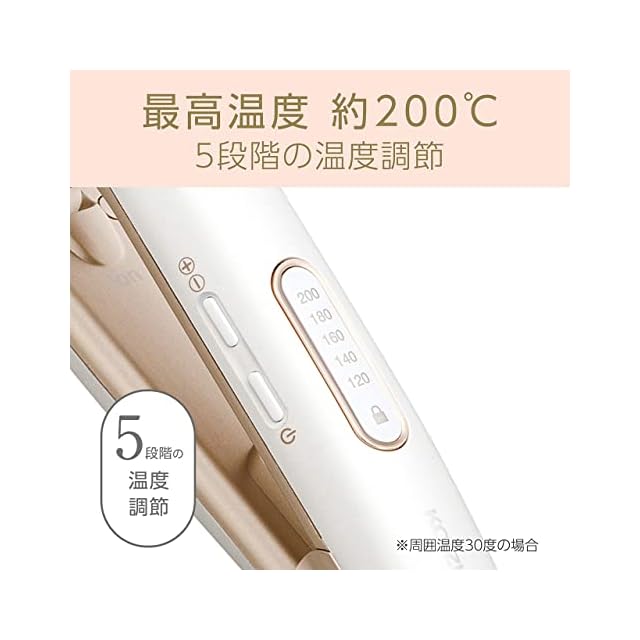 5段階温度調節(約120/140/160/180/200℃)。スタイリング時の押し間違えを防ぐ温度ロック機能。