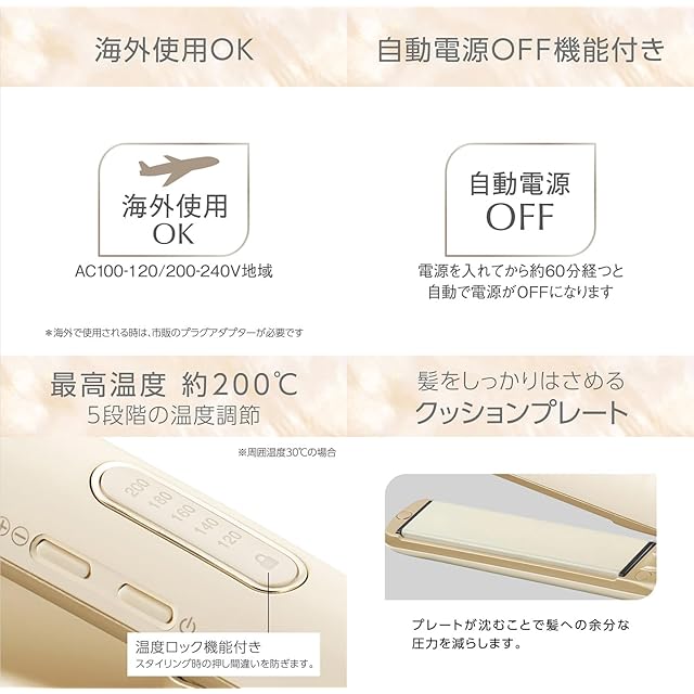 5段階温度調節(約120/140/160/180/200℃)、スタイリング時の押し間違えを防ぐ温度ロック機能
