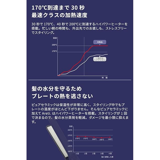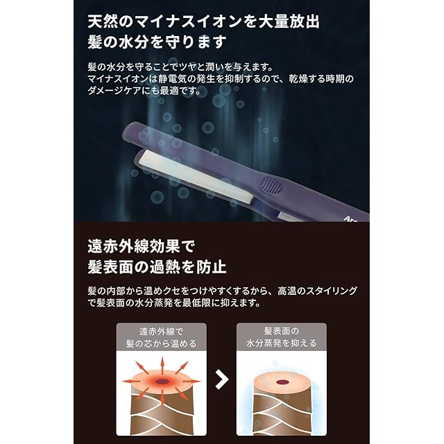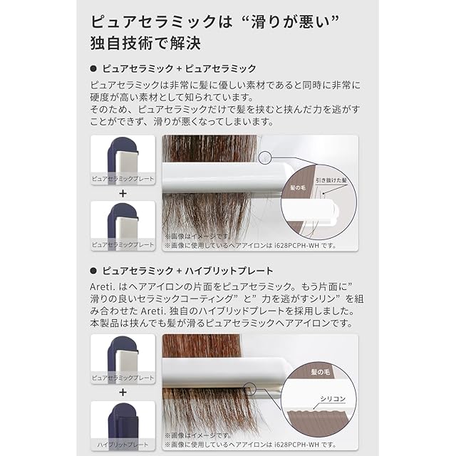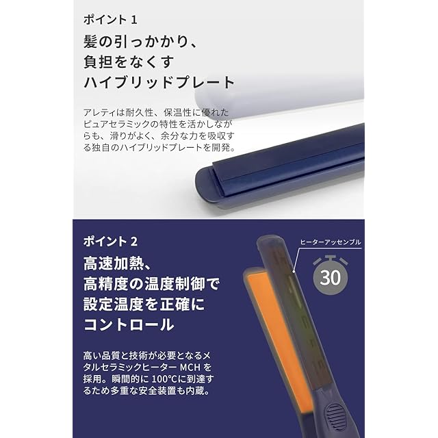 【 髪とプレートの密着性を高める独自のPCPH構造 】 20mmの 100% 純セラミックプレートから発生する天然のマイナスイオンが髪の水分蒸発を軽減し、ダメージを最小限に。髪にツヤと潤いを与えます。さらに、 アレティは独自技術のハイブリッドプレートを搭載し、髪に密着するセラミック素材の弱点を解消し、髪が押しつぶされることなく、毛先が逃げることもありません。また、ハイパワーヒーターを搭載することで、髪に触れてもプレート温度を一定に保ち、何度も髪を通す必要がなく髪への負担を抑えました。