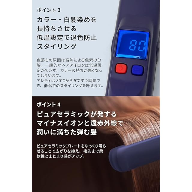 【イノベーションモデル】天然のピュアセラミックとシリコンを掛け合わせたハイブリッドプレートを搭載。髪のパサつき、広がり、枝毛などのダメージ毛をいたわり、ヘアカラーを長持ちさせる低温スタイリングが可能。スタイリングの時間をヘアケアの時間に変えるヘアアイロンです。