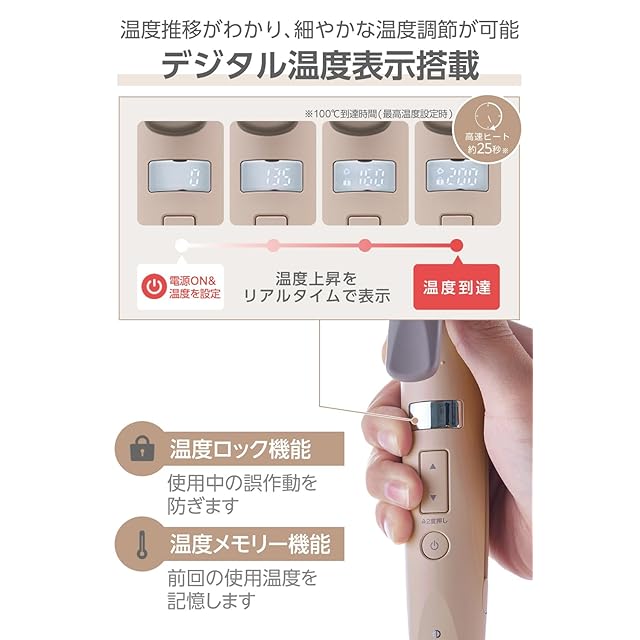 設定温度到達までのプレート温度をリアルタイムで表示。忙しい朝の準備時間の目安に便利です。温度幅80~200℃の5℃刻み25段階の細やかな温度調節が可能。髪質やダメージ状態に合わせて温度が選べます。※ 100℃到達時間(最高温度設定時)