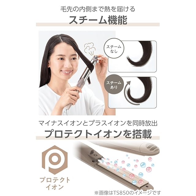 スチームによりプレートに触れていない内側の毛にも熱が伝わりやすく、スチームが毛束の内側まで熱を届けるので、多めの毛束を挟んでもOK&いたわり温度でもスタイリング&クセ付け力116.7%アップ。※IPM1832にて検証。160℃以上の高温に設定した場合の効果