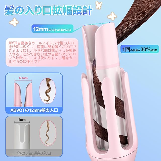 【髪の入口を広くするーーー1回の髪量が30%増加ーー貴重な時間を節約できます!】ABVOT自動巻きカールアイロンは髪の入口を特別に広くし、両側に髪を置くことができるようにし、小さな開口部からしか髪を入れることができない他の自動ヘアアイロンと比較して、より使いやすく、髪をカールするのに便利です。