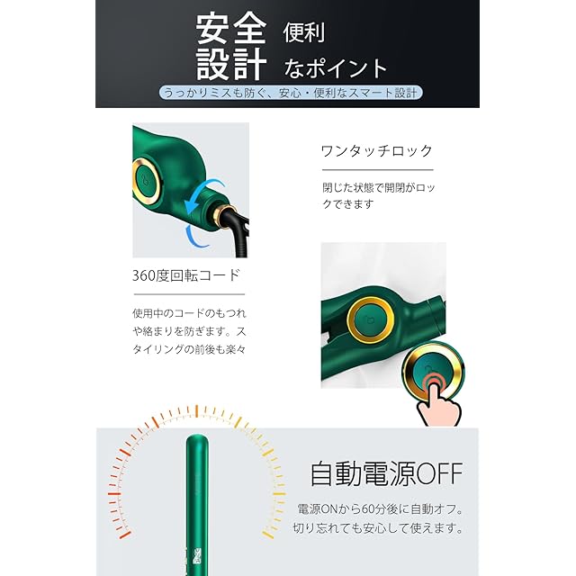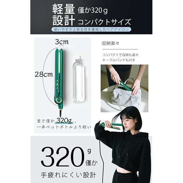 ④【軽量&コンパクト設計、ワンタッチロック付きで持ち運びもラクラク】 わずか数百グラムの軽量設計で、手が疲れにくく長時間の使用にも最適なヘアアイロン。コンパクトで収納・携帯性も抜群。ワンタッチロック機能付きなので、旅行や出張時にも安全・安心。自宅でも外出先でもスタイルをキープできます。
