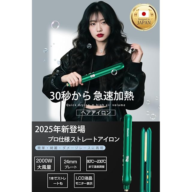【2025新登場・1億マイナスイオン噴出】 ヘアアイロン ストレート 2WAY ヘアストレートナー 80℃~230℃温度調整 LCD液晶モニター表示 360度回転コード ワンタッチロック 24mm ストレートアイロン 軽量 コンパクト ヘアスタイリング プロ仕様 初心者向け 男女兼用 (グリーン)