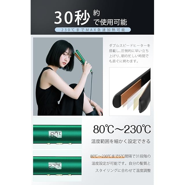 ②【80℃〜230℃の幅広い温度調整で全髪質に対応したヘアアイロン】 髪質やスタイルに合わせて80℃~230℃まで細かく温度設定が可能なヘアアイロン。LCD液晶モニターで温度を一目で確認でき、髪を傷めずに効率よくスタイリングできます。細い髪にも、太くて広がりやすい髪にも、プロ級の仕上がりを実現。