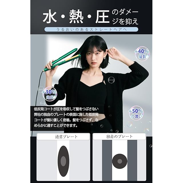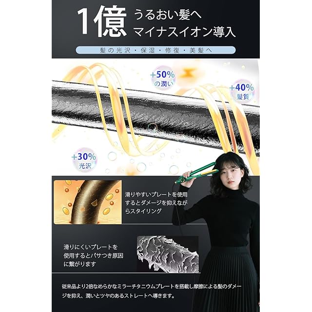 ③【マイナスイオン搭載で髪に優しいヘアアイロン】 静電気を抑え、潤いを与えるマイナスイオンを放出するヘアアイロン。髪のパサつきを抑え、ツヤのある美しい仕上がりに導きます。毎日使っても髪にやさしいため、ダメージが気になる方にもおすすめ。ヘアケアとスタイリングを両立したい方に最適です。