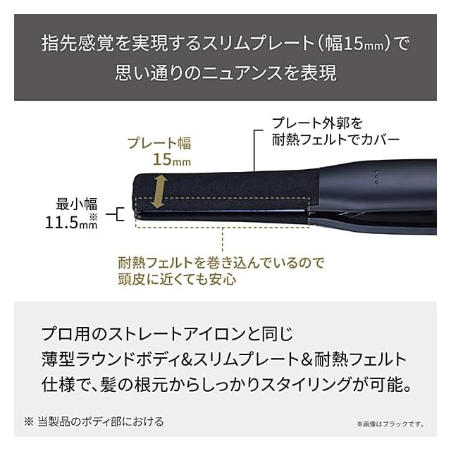 指先感覚を実現する15mm幅のスリムプレートと、髪の根元から差し込める最薄部11.5mm※1の薄型ヘッドを採用。短い髪でも指先で毛束をつまむような感覚で使えるから、ショートヘアーの女性や男性におすすめです。頭皮に近づくヘッドの外側は耐熱フェルトでカバーし、火傷のリスクを低減します。※1 当製品のボディ部において