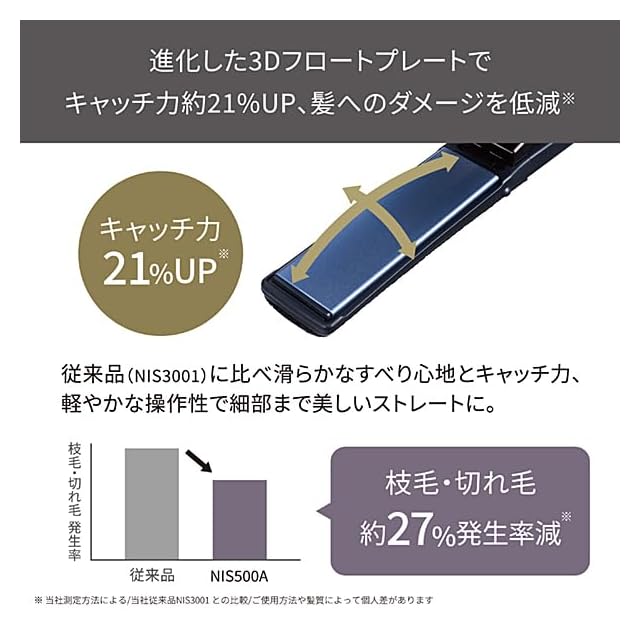 新構造の3Dフロートプレートで従来機種よりなめらかな滑り心地を実現。髪の引っ掛かりの一因となるプレートの歪みを減らし、プレートの平滑度も向上。髪へのダメージを抑え、心地よくお使いいただけます。※2 当社測定方法による/当社従来品NIS3001との比較/ご使用方法や髪質によって個人差があります