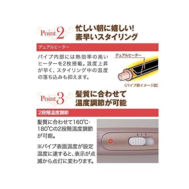 【髪質に合わせた温度調節】髪質に合わせて160℃・180℃の2段階温度調節が可能です。髪質が違う姉妹や友人同士でも一緒に使いやすい仕様です。※ パイプ表面温度が設定温度に達すると、 表示が点滅から点灯に変わります。