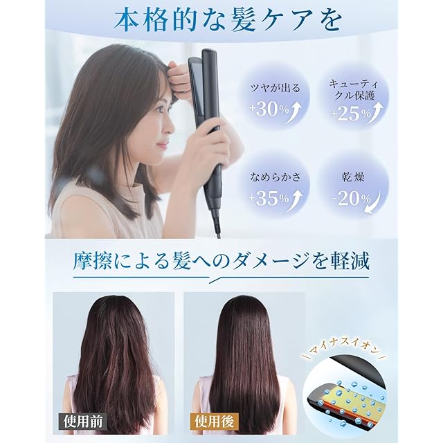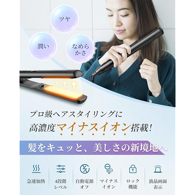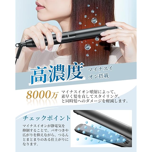【高濃度マイナスイオン搭載・髪へ潤いとツヤ感を与え】:ダメージを起こさないケアに大切な3要素「水・熱・圧」に基づいて従来品より品質を向上したこのヘアーアイロンは、挟む力もよりアップ、出る熱と髪の水分量をある程度でコントロールし、水分がギュッと詰まったレア質感を作り出してサロン帰りの髪のようなしっとりやわらかな髪を保持します。※ご注意:効果は、使用環境・髪質により異なリます。それに、静電気が起こりやすい髪質の人にとっては、高濃度マイナスイオン搭載されたこのヘアーアイロンは一番!なぜかというと、静電気がプラスイオンなので、そこにアイロンによって発生したマイナスイオンで中和させ、静電気を抑制できるというわけですね。マイナスイオンが発生すると空気中の水分が細分化されて微粒子になることで髪に浸透しやすくなり、うるおいを保ち手触りも良くなります。