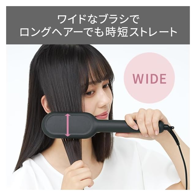 ワイドなブラシで広範囲の髪をキャッチし、ロングヘアーでも時短ストレート。忙しい朝でもとかすだけで簡単にクセ直しができます。