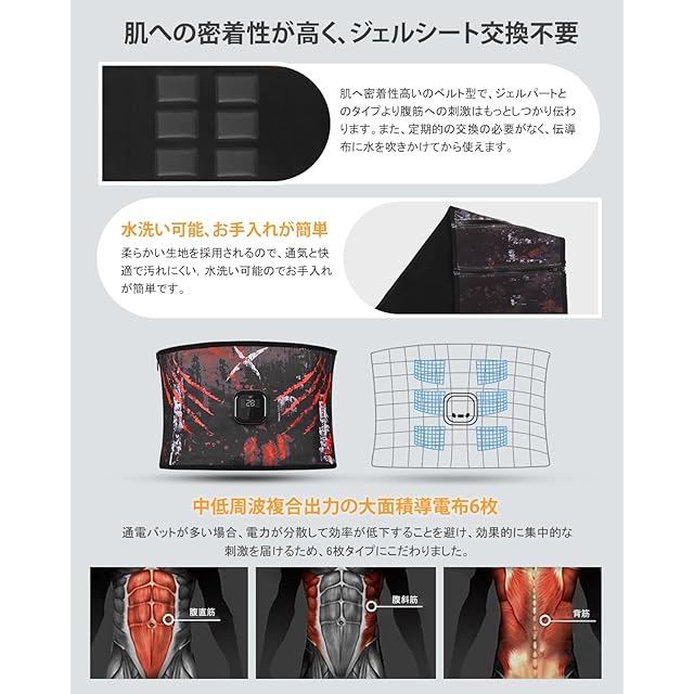 ▲【洗える生地・軽くて快適】生地がとてもやわらかい、軽くて快適で、肌に密着していて、伝導布に水を吹きかけてから使えます。高い伸縮性の布製で人間工学に合ったデザインで、どんな体形にもフィットします。大型6枚伝導布を採用して、集中的に腹部筋肉に刺激を与える、お腹周りの筋肉を動かし、6パッド腹筋以外に腹斜筋にも集中的に刺激を届けれます。従来のEMS腹筋ベルトと比べて、変形しにくい長持ち使用できます。洗净しやすく、使い回しが経済的でとてもお得です。持ち運びにもとても便利です。ベルトが水洗い可能、手入れが簡単なので、いつでも清潔な状態で使用できます。