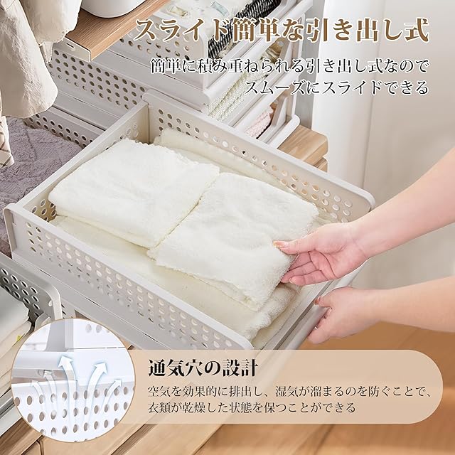 【通気性・中身確認可】半開の設計で、収納ボックスの中身が一目で確認でき、納した衣類を探しやすくて、使い勝手が良いです。通気穴の設計で、空気を効果的に排出し、湿気が溜まるのを防ぐことで、衣類が乾燥した状態を保つことができ、湿気による傷みやカビの発生を防ぎます。