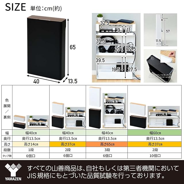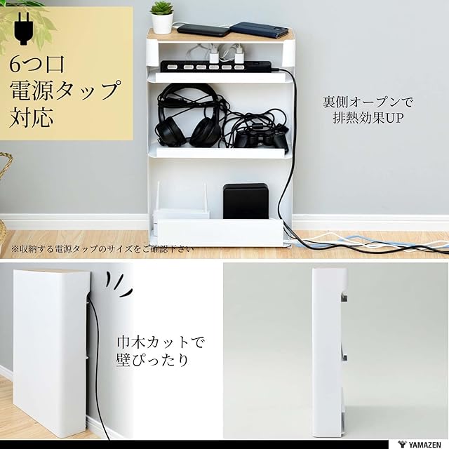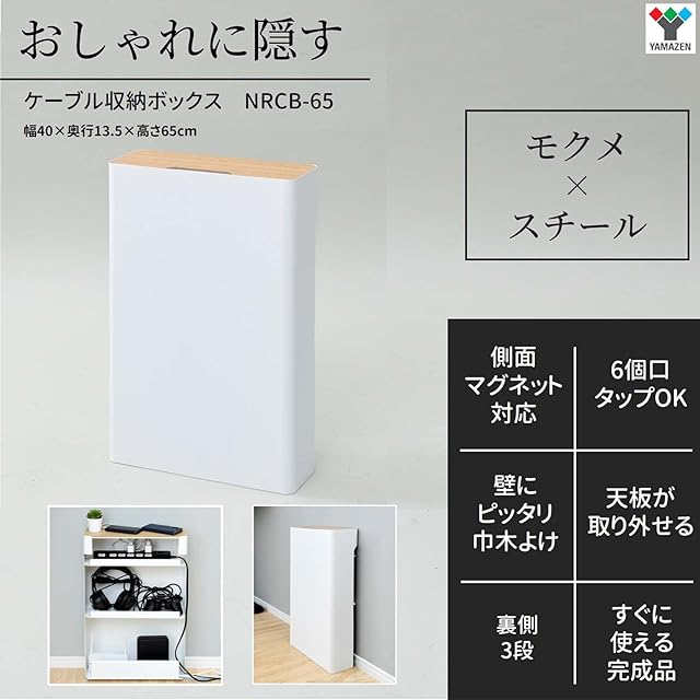 山善(YAMAZEN) ケーブルボックス 大型 3段 (ルーター 収納) スチール製(マグネット対応) 6つ口タップ 天板開閉 壁にぴったり(巾木よけ) 滑り止め 幅40×奥行13.5×高さ65㎝ 完成品 ホワイト NRCB-65(WN/MWH)