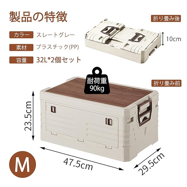 LongYi 収納ボックス 折り畳みコンテナ 木製の蓋付き 折りたたみ 収納ケース 取っ手付き コンテナ ボックス キャンプ 大容量 アウトドア 厚み 強い耐荷重 組み立て簡単 家庭用 寝室 屋外 車用 衣類 書類 収納 グレー 2個セット M 幅47.5×奥行29.5×高さ23.5cm 32L