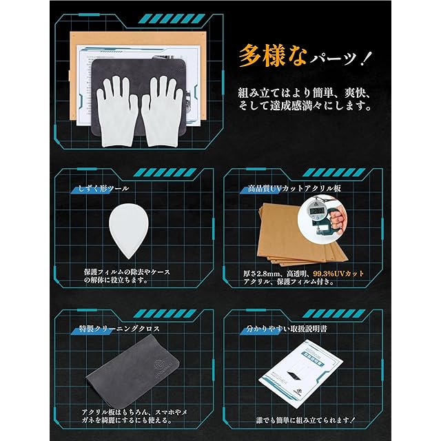 【安心できる】 ● デザイン特許を取得した三角形コネクター固定構造設計は、はめ込み式展示ケースよりも安定しており、運搬されても、揺れを受けても簡単に解体しない ● 耐荷重も大きい、上にさまざまなアイテムが置けます ● アクリル板に角丸加工を施します、手に優しい ● オリジナルの組み立て工具、特製クリーニングクロスや手袋が付属しており、簡単に組み立てや分解ができます。
