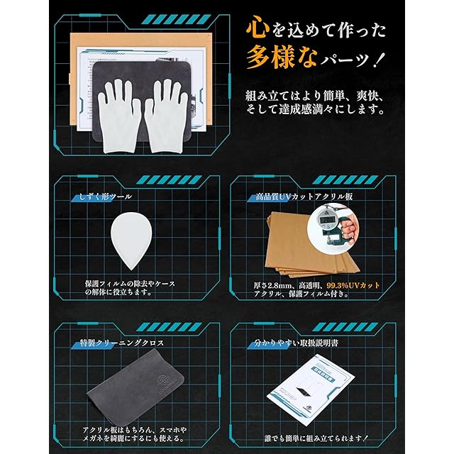 【安心できる】 ● デザイン特許を取得した三角形コネクター固定構造設計は、はめ込み式展示ケースよりも安定しており、運搬されても、揺れを受けても簡単に解体しない ● 耐荷重も大きい、上にさまざまなアイテムが置けます ● アクリル板に角丸加工を施します、手に優しい ● オリジナルの組み立て工具、特製クリーニングクロスや手袋が付属しており、簡単に組み立てや分解ができます。
