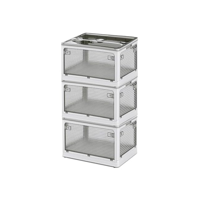 【5面全方向オープン設計】前後左右+天面の8方向から自由にアクセス可能な収納ボックス。衣類・漫画・ぬいぐるみ収納時に詰め込み順を気にせずポイポイ収納可能。従来型の片面開口ケースと違い、積み重ね状態でも下段の物が簡単に取り出せる三段ボックス構造。家庭用クローゼットから車内収納まで幅広く活用できる大容量デザインです。