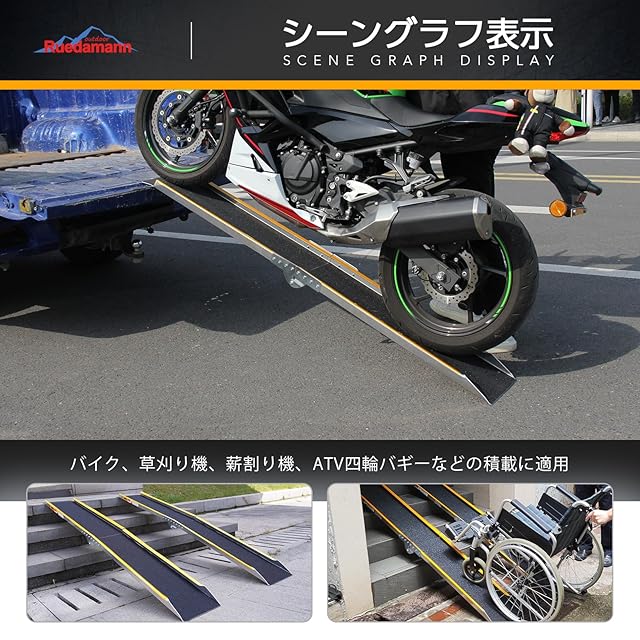 幅広い対応:Ruedamannのバイクラダーは、単本使用時の耐荷重は300kgで、電動自転車やバイクなどの積載車へ積み込む際に使いやすいアルミスロープです。2本を購入して一緒に使用場合、耐荷重は600kgで、ATV四輪バギー、草刈り機、薪割り機などの設備を小屋、納屋、ガレージへ積み込むためのアルミラダーレールです。