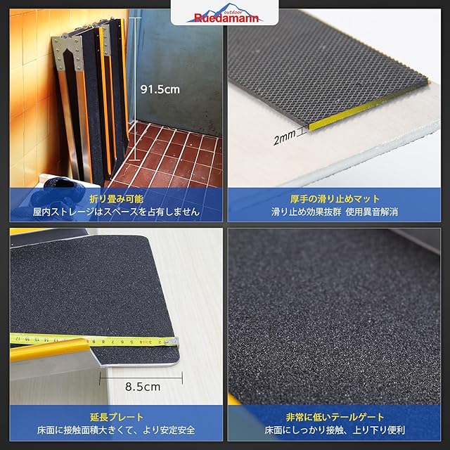 しっかり安定・安全:先端の延長プレート設計により接触面積が広く、バイクなどの設備もスムーズに登れます。両サイドガードの高さは4cmで、走行中の車輪の落下を防止します。バリ取り加工済みで、手やタイヤに安全です。黄色テープで目立たせ、さらにタイダウンベルトでバイクラダーレールを固定すると、使用中の安全性がより高まります。