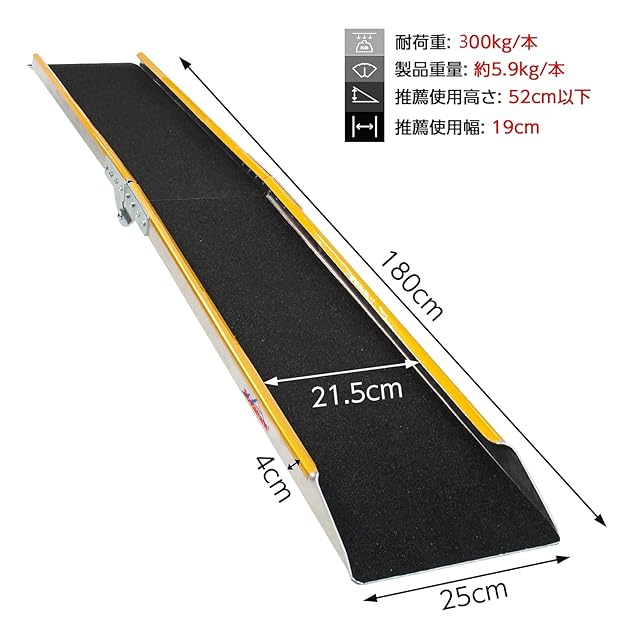 積み下ろしに最適:バイクスロープは長さ180×幅25cm(内幅:21.5cm)、使用高さは52cm以下に対応しています。最大耐荷重は300kgで、バイクや自転車などの積み降ろしに最適です。