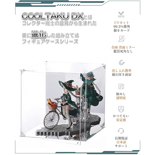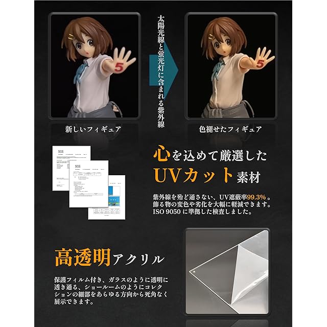 【UVから守る】フィギュアの日焼けによる劣化を防ぐUVカット加工を施している。UVカット率99.3%以上(※ISO9050準拠)、紫外線からのダメージをしっかりガードできる!● 壊れにくい、厳選した厚さ2.8mmの高透明アクリル素材を使用、貴重なコレクションを確実に保護します。