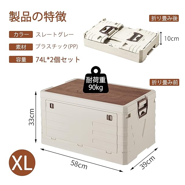 LongYi 収納ボックス 折り畳みコンテナ 木製の蓋付き 折りたたみ 収納ケース 取っ手付き コンテナ ボックス キャンプ 大容量 アウトドア 厚み 強い耐荷重 組み立て簡単 家庭用 寝室 屋外 車用 衣類 書類 収納 グレー 2個セット XL 幅58×奥行39×高さ33cm 74L