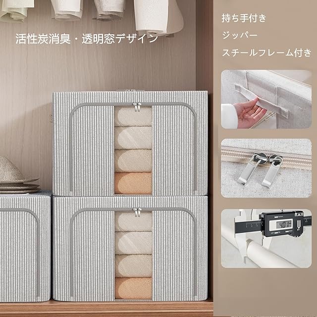 収納ボックス 収納ケース2点セット 66L大容量 衣類収納 折りたたみ 取っ手付き ふた付き おしゃれ 布製 衣装ケース 透明窓付き ファスナー (グレー&ボーダー柄)