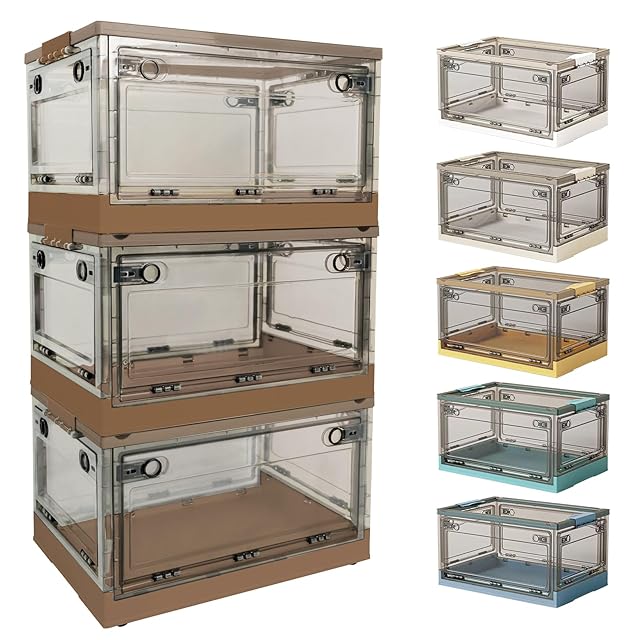 Hellozebra 収納ボックス 折り畳み【透明·全方向から取り出せる·大容量85L/56L/40L】コンテナ 収納ケース コンテナボックス 収納コンテナ 蓋付き 積み重ね キャスター付き ロック付き 組み立て簡単 省スペース 厚み 強い耐荷重 衣類/小物/お菓子/おもちゃ/本類 家庭用/オフィス用/車用 XLサイズ ブラウン(3個セット,56L)