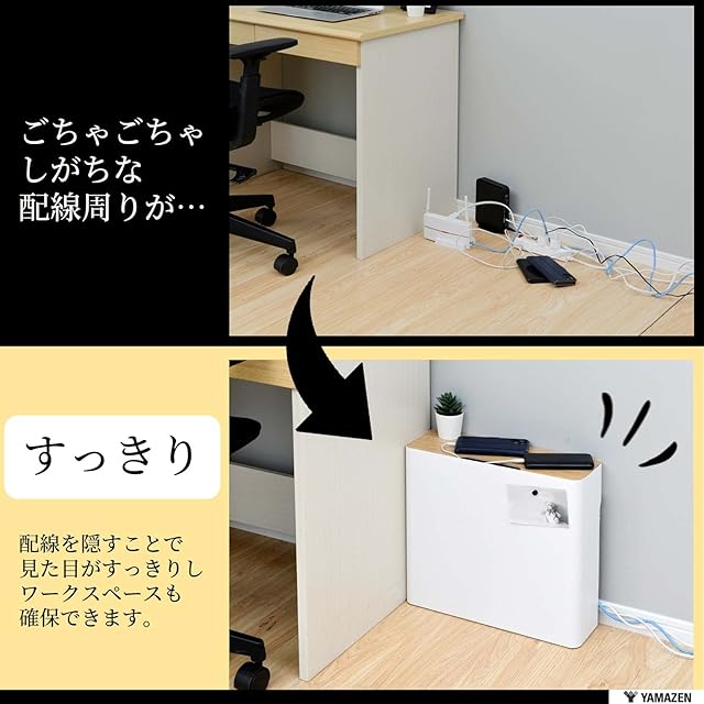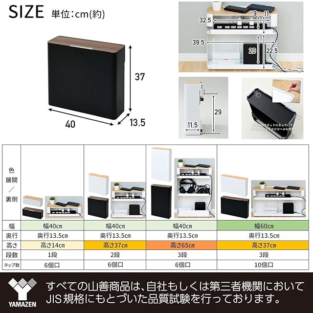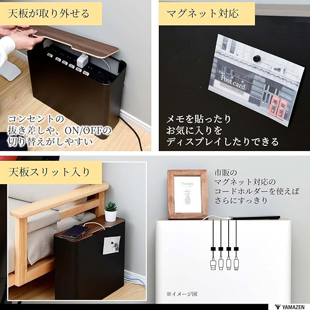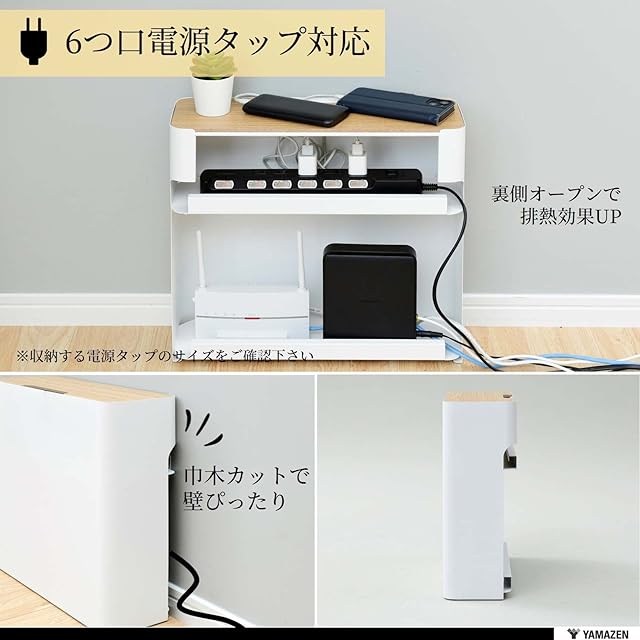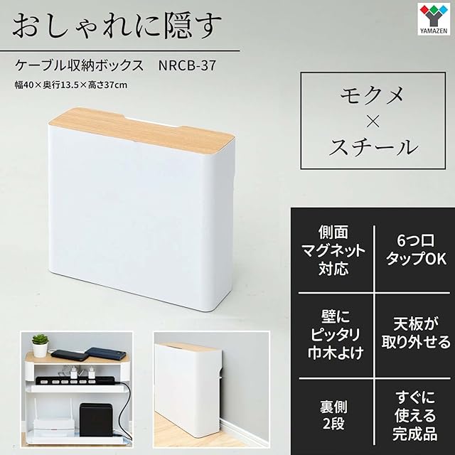 山善(YAMAZEN) ケーブルボックス 大型 (ルーター 収納) スチール製(マグネット対応) 6つ口タップ 天板開閉 壁にぴったり(巾木よけ) 滑り止め 幅40×奥行13.5×高さ37㎝ 完成品 ホワイト NRCB-37(WN/MWH)