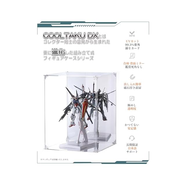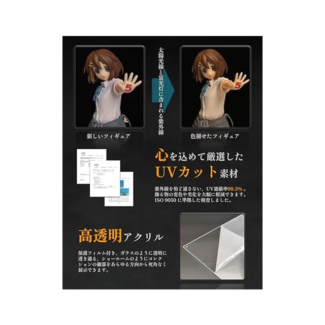 【UVから守る】フィギュアの日焼けによる劣化を防ぐUVカット加工を施している。UVカット率99.3%以上(※ISO9050準拠)、紫外線からのダメージをしっかりガードできる!● 壊れにくい、厳選した厚さ2.8mmの高透明アクリル素材を使用、貴重なコレクションを確実に保護します。
