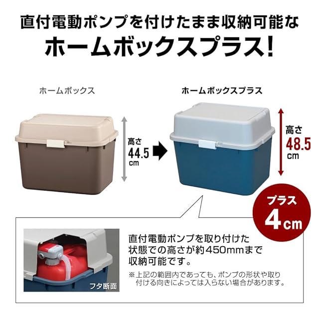 ポリタンクに直付電動ポンプを取り付けたまま収納可能です。(ポンプ取付時高さ450mmまで)