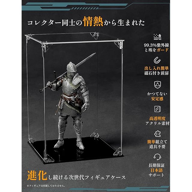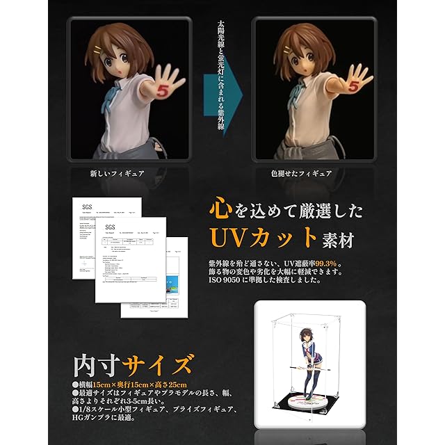 【UVから守る】フィギュアの日焼けによる劣化を防ぐUVカット加工を施している。UVカット率99.3%以上(※ISO9050準拠)、紫外線からのダメージをしっかりガードできる!● 壊れにくい、厳選した厚さ2.8mmの高透明アクリル素材を使用、貴重なコレクションを確実に保護します。
