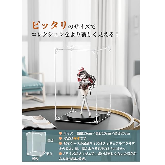 【サイズを決める】● 内寸サイズ:横幅15cm×奥行15cm×高さ25cm ● 外寸サイズ:横幅16.6cm×奥行16.3cm×高さ26cm ● 展示ケースの推奨寸法は飾る物の(幅・奥行×1.1)+5cm、(高さ×1.1)+2cm ● プライズフィギュア、HGガンプラ、S.H.フィギュアーツ、ロボット魂に適したサイズです。
