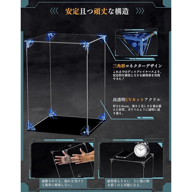【安心できる】 ● デザイン特許を取得した三角形コネクター固定構造設計は、はめ込み式展示ケースよりも安定しており、運搬されても、揺れを受けても簡単に解体しない ● 耐荷重も大きい、上にさまざまなアイテムが置けます ● アクリル板に角丸加工を施します、手に優しい ● オリジナルの組み立て工具、特製クリーニングクロスや手袋が付属しており、簡単に組み立てや分解ができます。