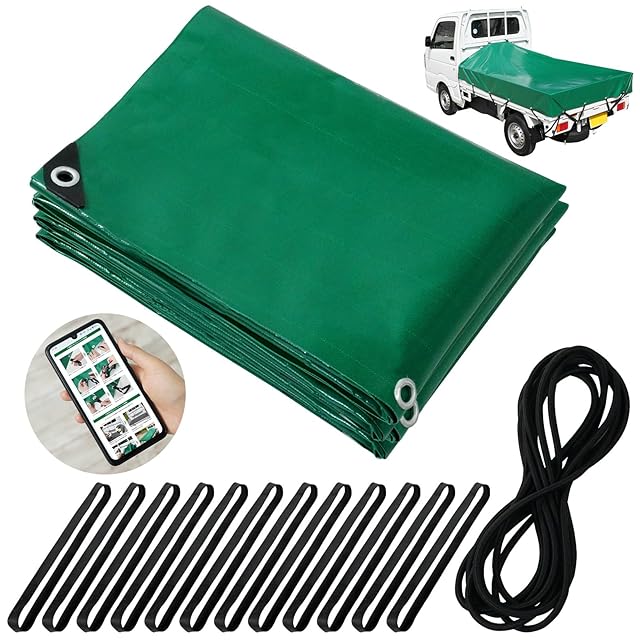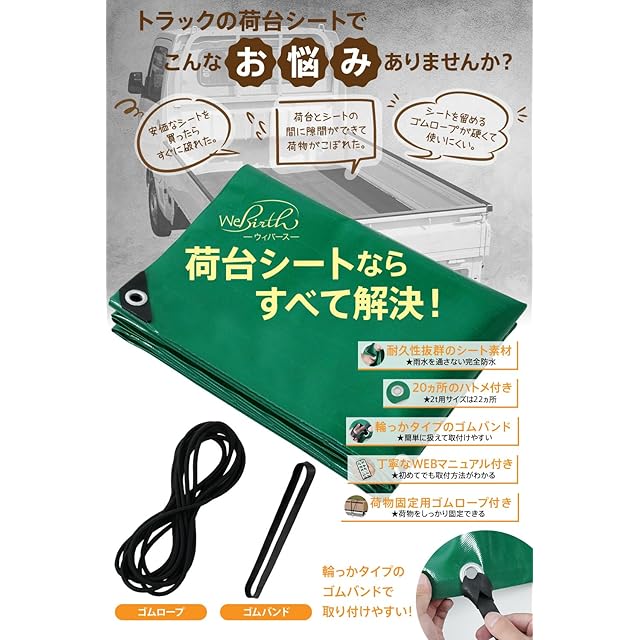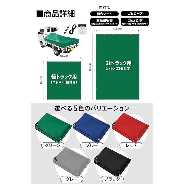 Webirth 荷台シート 設置用輪ゴムと荷物固定用ロープつき 軽トラック 2tトラック 軽トラ トラックシート グレー グリーン (グリーン3.6m×2.4m 2tトラック用)