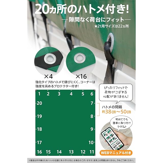 【耐久加工を施した20箇所のハトメつき! 】荷台とトラックシートの隙間から雨が入り込んだ、そのようなことがないよう自社オリジナルでハトメの数を増やしました。従来の荷台シートと比較して隙間なく荷台にフィットして、荷台の荷物を守ります。