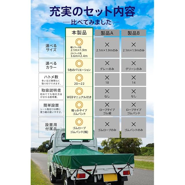 付属品 ①荷台シート本体 ②輪っかタイプのゴムバンド12本 ③荷物固定用のゴムロープ5m ④シート取りつけ用の簡易WEBマニュアル