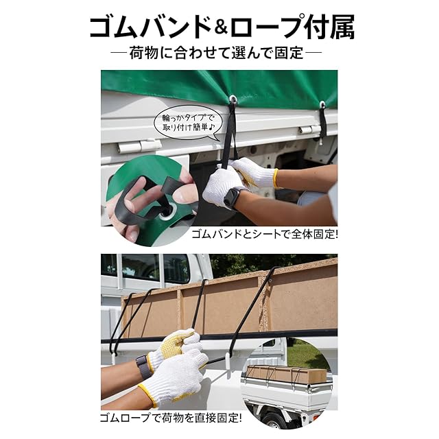 【輪っかタイプのゴムバンドで簡単にトラックシートを固定します! 】扱いやすい輪っかタイプのゴムバンド! 初心者の方もカンタンに荷台シートを取り付けることができます