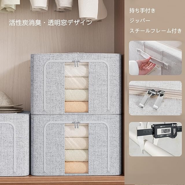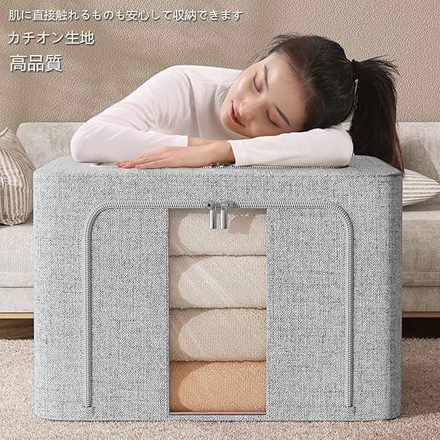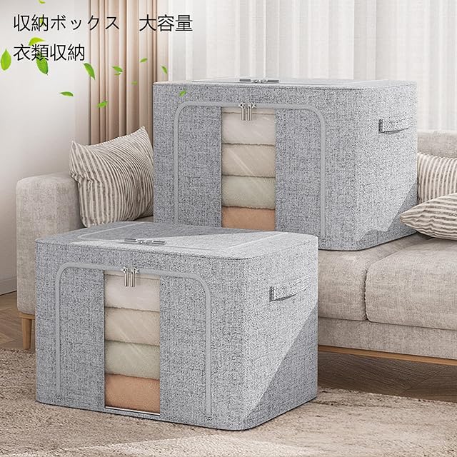 収納ボックス 収納ケース2点セット 66L大容量 衣類収納 折りたたみ 取っ手付き ふた付き おしゃれ 布製 衣装ケース 透明窓付き ファスナー (グレー-66L)