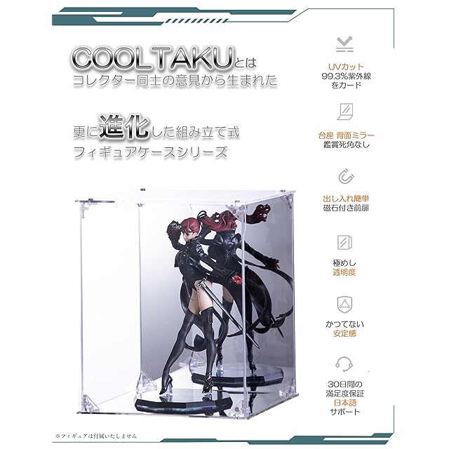 【UVから守る】フィギュアの日焼けによる劣化を防ぐUVカット加工を施している。UVカット率99.3%以上(※ISO9050準拠)、紫外線からのダメージをしっかりガードできる!● 壊れにくい、厳選した厚さ2.8mmの高透明アクリル素材を使用、貴重なコレクションを確実に保護します。