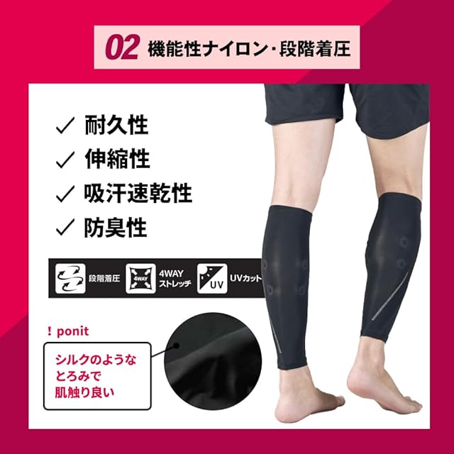 脚の内側から外側にかけてパワーネットを配置、脚が外側に広がるのを抑制し、段階着圧設計でランニング時などの脚への負荷を軽減する効果が期待できます。