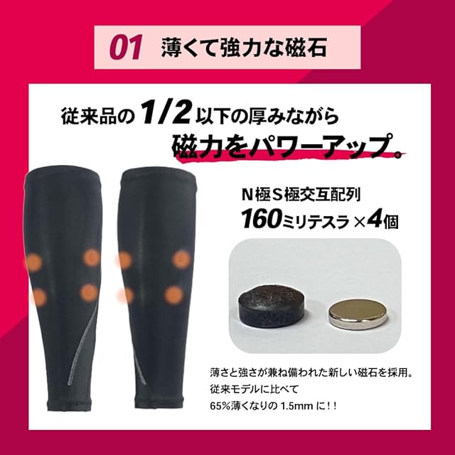 ひらめ筋付近に、160ミリテスラの薄型希土類永久磁石4個(x左右ペア)を、コラントッテ独自のN極S極交互配列で配置。装着部位の血行を改善、筋肉のコリを緩和します。