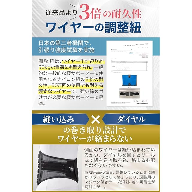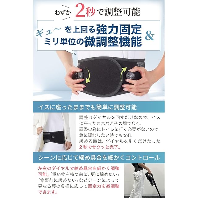 【特許取得のダイヤルで瞬間調整】ダイヤルを回すだけでワイヤーを確実に引き締め、腰をしっかりサポート。椅子に座ったままでも簡単に調整ができるので、調整の為に席を外す必要がないので、デスクワークの方にも嬉しい仕様。食事前に緩めたいときもダイヤルを引くだけで簡単に緩められます。