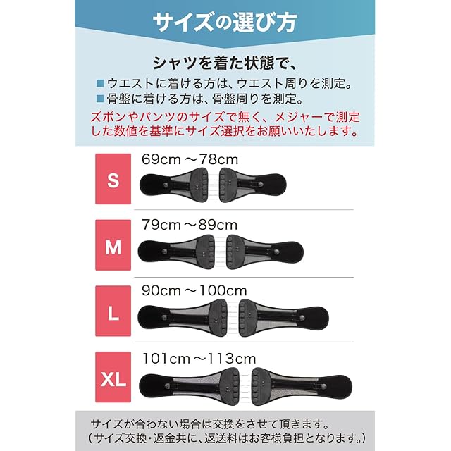 【サイズ】S:69~78㎝ M:79~89㎝ L:90~100㎝ XL:101~113㎝(シャツを着た状態で、ウエストに着ける方はウエスト周りを測定。骨盤に着ける方は骨盤周りを測定)